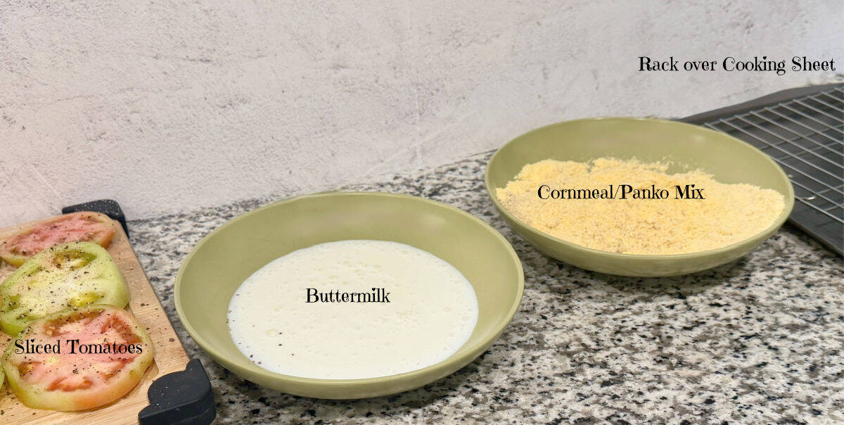 - Dip each slice into the buttermilk, then into the cornmeal-panko mixture, pressing lightly to coat.Return to the buttermilk, then coat again in the cornmeal-panko mixture.Place on the wire rack. Repeat with all slices.